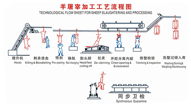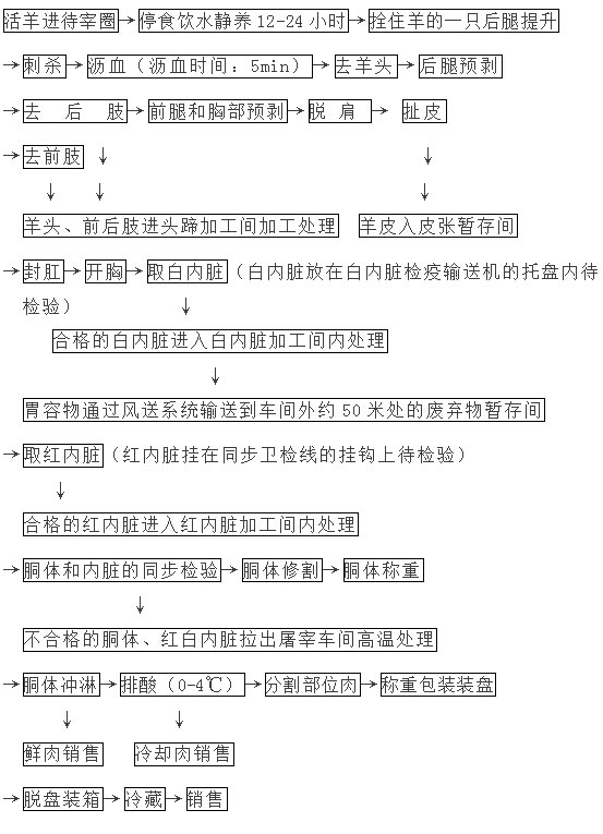 二、 肉羊屠宰加工工艺1、待宰圈管理(1)、卸车前应索取产地动物防疫监督机构开具的合格证明,并临车观察,未见异常,证货相符后准予卸车。(2)、经清点头数,用轻拍的方式驱赶健康的羊进入待宰圈,按羊的健康状况进行分圈管理。待宰圈的占地面积按每只羊0.6-0.8㎡设计。(3)、待宰的羊送宰前应停食静养24小时,以便消除运输途中的疲劳,恢复正常的生理状态,在静养期间检疫人员定时观察,发现可疑病羊送隔离圈观察,确定有病的羊送急宰间处理,健康合格的羊在宰前3小时停止饮水。2、刺杀放血(1)、卧式放血:用V型输送机将活羊输送到屠宰车间,在输送机上输送的过程中用手麻电器将羊击晕,然后在放血台上持刀刺杀放血。(2)、倒立放血:活羊用放血吊链拴住一只后腿,通过提升机或羊放血线的提升装置将毛羊提升进入羊放血自动输送线的轨道上再持刀刺杀放血。(3)、羊放血自动输送线轨道设计距车间的地坪高度不底于2700mm,在羊放血自动输送线上主要完成的工序:上挂、刺杀、沥血、去头等,沥血时间一般设计为5min。3、预剥扯皮(1)、倒挂预剥:用羊用叉挡将羊的两后腿叉开,以便前腿、后腿和胸部的预剥。(2)、平衡预剥:放血/预剥自动输送线的挂钩勾住羊的一只后腿,扯皮自动输送线的挂钩勾住羊的两前腿,这两条自动线的速度是同步前进的,羊的腹部朝上,背部朝下,平衡前进,在输送的过程中进行预剥皮。这种预剥的方式可有效的控制在预剥过程中羊毛粘在胴体上。(3)、用羊用扯皮机的夹皮装置夹住羊皮,从羊的后腿往前腿方向扯下整张羊皮;根据屠宰的工艺,也可从羊的前腿往后腿方向扯下整张羊皮。(4)、将扯下的羊皮通过羊皮输送机或羊皮风送系统输送到羊皮暂存间内。4、胴体加工(1)、胴体加工工位:开胸、取白内脏、取红内脏、胴体检验、胴体修割等,都是在胴体自动加工输送线上完成的。(2)、打开羊的胸腔后,从羊的胸膛内取下白内脏,即肠、肚。把取出的白内脏放入同步卫检线的托盘内待检验。(3)、取出红内脏,即心、肝、肺。把取出的红内脏挂在同步卫检线的挂钩上待检验。(4)、羊胴体进行修整,修整后进入轨道电子秤进行胴体的称重。根据称重的结果进行分级盖章。5、同步卫检(1)、羊胴体、白内脏、红内脏通过同步卫检线输送到检验区采样检验。(2)、检验不合格的可疑病胴体,通过道岔进入可疑病胴体轨道,进行复检,确定有病的胴体进入病体轨道线,取下有病胴体放入封闭的车内拉出屠宰车间处理。(3)、检验不合格的白内脏,从同步卫检线的托盘内取出,放入封闭的车内拉出屠宰车间处理。(4)、检验不合格的红内脏,从同步卫检线的挂钩上取下来,放入封闭的车内拉出屠宰车间处理。(5)、同步卫检线上的红内脏挂钩和白内脏托盘自动通过冷-热-冷水的清洗和消毒。6、副产品加工(1)、合格的白内脏通过白内脏滑槽进入白内脏加工间,将肚和肠内的胃容物倒入风送罐内,充入压缩空气将胃容物通过风送管道输送到屠宰车间外约50米处,羊肚有洗羊肚机进行烫洗。将清洗后的肠、肚整理包装入冷藏库或保鲜库。(2)、合格的红内脏通过红内脏滑槽进入红内脏加工间,将心、肝、肺清洗后,整理包装入冷藏库或保鲜库。7、胴体排酸(1)、将修割、冲洗后的羊胴体进排酸间进行“排酸”,这是羊肉冷分割工艺的一个重要环节。(2)、排酸间的温度:0-4℃,排酸时间不超过16小时。(3)、排酸轨道设计距排酸间地坪高度不底于2200mm,轨道间距:600-800mm,排酸间每米轨道可挂5-8只羊胴体。8、剔骨分割包装(1)、吊剔骨:把排酸后羊胴体推到剔骨区域,羊胴体挂在生产线上,剔骨人员把切下的大块肉放在分割输送机上,自动传送给分割人员,再由分割人员分割成各个部位肉。(2)、案板剔骨:把排酸后羊胴体推到剔骨区域,把羊胴体从生产线上拿下来放在案板上剔骨。(3)、分割好的部位肉真空包装后,放入冷冻盘内用凉肉架车推到结冻库(-30℃)结冻或到成品冷却间(0-4℃)保鲜。(4)、将结冻好的产品脱盘后装箱,进冷藏库(-18℃)储存。(5)、剔骨分割间温控:10-15℃,包装间温控:10℃以下。